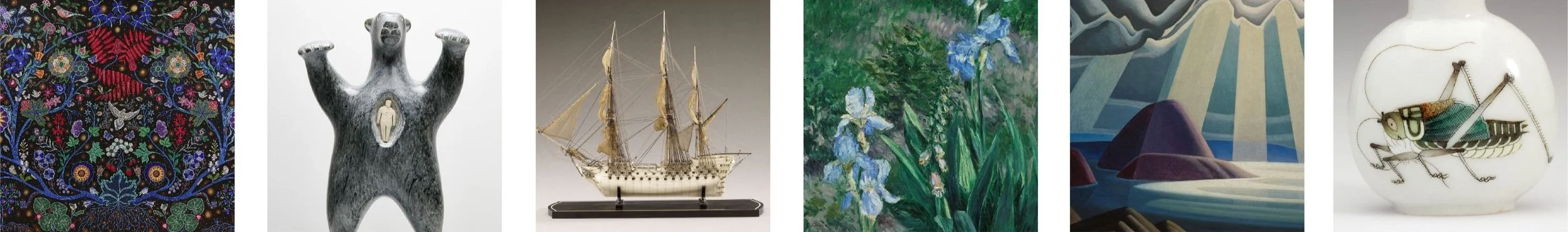 1. The Wisdom of the Universe by Christi Belcourt | 2. Spirit Bear Possessing a Man’s Soul by David Ruben Piqtouken | 3. French or British warship, prisoner of War model c.1795-1815 | 4. Iris bleus, jardin du Petit Gennevilliers by Gustave Caillebotte | 5. Lake Superior by Lawren S. Harris | 6. Chinese Snuff Bottle, with enameled cricket